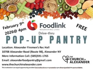 We will have our next Foodlink Drive Thru Pop up Pantry on December 8th at 4pm at the Alexander Firemen’s Rec Hall 10708 Alexander Road (Route 98), Alexander NY This is a FREE food giveaway open to anyone in our area. If you have any questions feel free to call the...