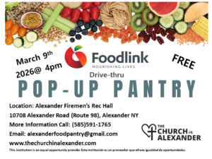 Food Pantry Donations Needed! Our Food Pantry is low on several items and we are hoping the community may be able to help! Donations can be dropped off during Food Pantry Hours Tuesdays 5-7pm & Wednesdays 9-11am or call the church at 585-591-1765 to set up a drop...